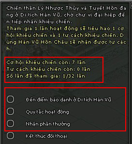- Tạm thời chưa mở hoạt động này tại máy chủ Huyền Thiết Trọng Kiếm, Phong Vân Kiếm và Thượng Phương Bảo Kiếm(cụm Danh Kiếm).